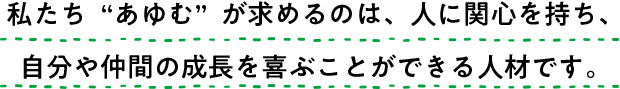 私たち“あゆむ”が求めるのは、人に関心を持ち、自分や仲間の成長を喜ぶことができる人材です。私たちあゆむには、共に成長する仲間がいます。それは時に厳しい先輩として、時に温かな家族としてあなたを迎え、楽しさや喜び、そして困難をも分かち合いながら、あなたの成長を見守ってくれることでしょう。そしてその良い連鎖を次世代に繋げていくのも、将来成長したあなたなのです。