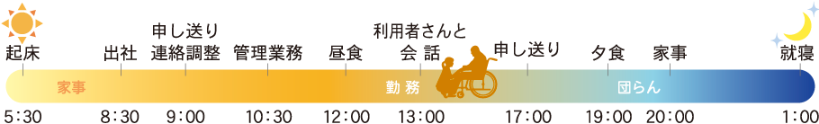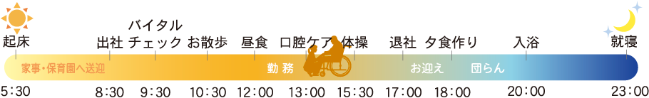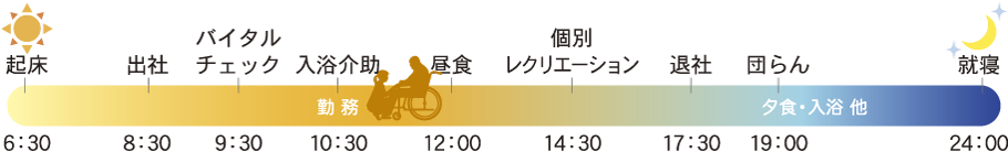 介護職は大変ですがその分やりがいがあります。本人の気の持ち方かもしれませんが、私はここで揉まれて成長しようと思っていますし、またそういう努力を楽しもうというモットーがあります。仕事とは楽しくするものだ!そういう自分でありたいと思っています。それで笑顔を心がけています。みんなが笑顔になったら楽しくできる。仕事はなんでも大変だと思いますが、やりがいを求めるのでしたら、介護は面白いと思います。ご家族からも、利用者さんからも、「ありがとう」と言ってもらえるのですから。ある1日のスケジュール