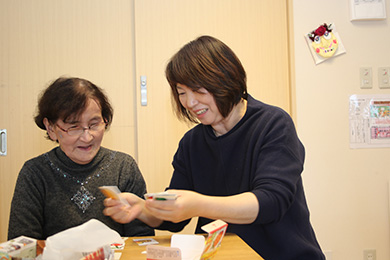 「パートなのですが、社員とパートの区別がないので、のびのび働いています。スタッフ同士の関係もいいし、みんないつも笑顔です。最初はできないこともありました。実は料理が苦手だったのですが、ここにきてからは、料理をしたり、お菓子を作ったり、それなりにできるようになって…いまでは楽しいと思うようになりました。利用者さんの笑顔や「ありがとう」って、感謝の言葉があるからだと思います。頑張っているから余計にそう感じるのでしょうね。」