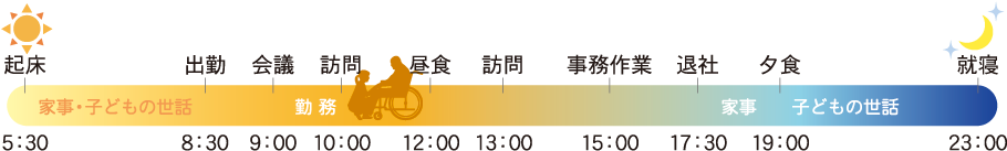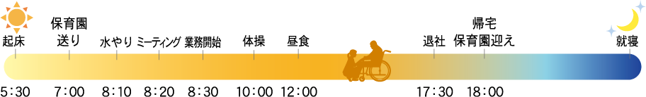 実は、もうすぐ産休に入ります。子供がお腹にいながら働くのは、この事業所では初のケースで、誰もどうしたら良いかわからない状況でした。でもみんなサポートしてくれているので不安もなく、とても働きやすい職場です。ある1日のスケジュール