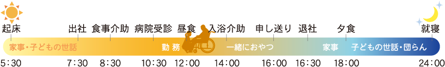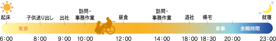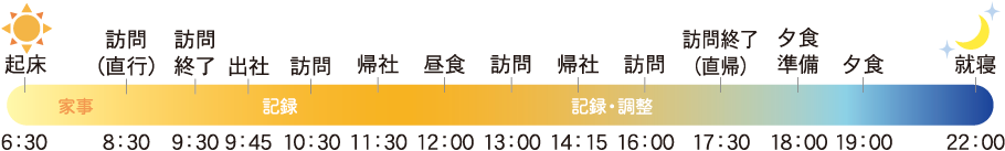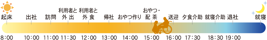 利用者さんと接する時には一人で接するので、他の利用者さんと他のヘルパーが接しているところは見えません。もしかするとヘルパーにより利用者さんの態度が変わっているかもしれませんが、そこはわからないのです。ですから、スタッフ同士で話をして共有するようにしています。そういう話し合いが自然にできているのですね。会社のルールでなくて自然に、とても良い雰囲気ですよ。ある1日のスケジュール